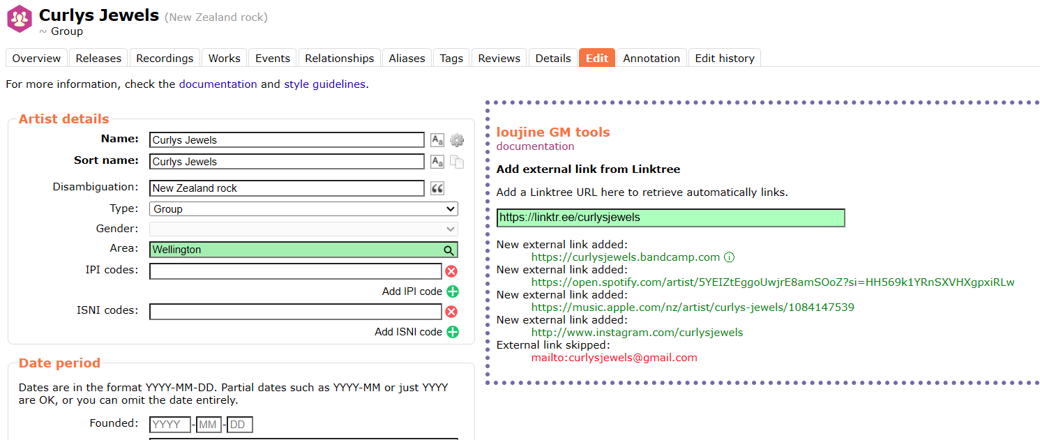 I will also note that this script leans heavily on @loujine’s excellent userscript and tools that do the same for wikidata/wikipedia/VIAD/ISNI. AI would not be able to write any of these scripts without taking from existing scripts from our passionate script writing community. Hopefully everyone can forgive my desecration in the name of more efficient and accurate MB data entry ![]()