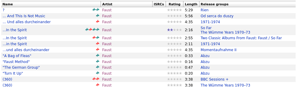 I’ve finally polished my userscript to detect duplicate recordings for public consumption (hopefully). Inspired by Musicbrainz: Compare AcoustIDs easier! but reimplemented from scratch because I couldn’t get my head around how to make it do what I wanted with the batching it uses - now it queries track by track and is much slower, but works also for releases with over 100 tracks and on recording pages.