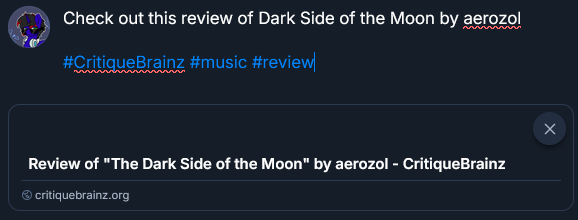 I have found out that there is the ability to share a review to social media. However, it seems as if there is only twitter, which people are slowly leaving for the likes of Bluesky and Mastodon. I am aware of online tools such as Add To Any, and I was wondering if this would get integrated if possible into CritiqueBrainz?