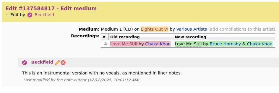 I’m editing this release because one of the recordings (an instrumental) was incorrectly merged with a version that included vocals.