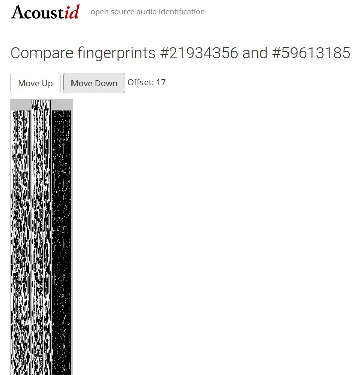 If you get the Offset to +17 between these two IDs, the third column turns nearly all black. I presume that the darker this column is, the more similar the fingerprints are, and truly identical fingerprints would result in a completely black column. However, when I compared these two fingerprints, the result was not a completely black third column: