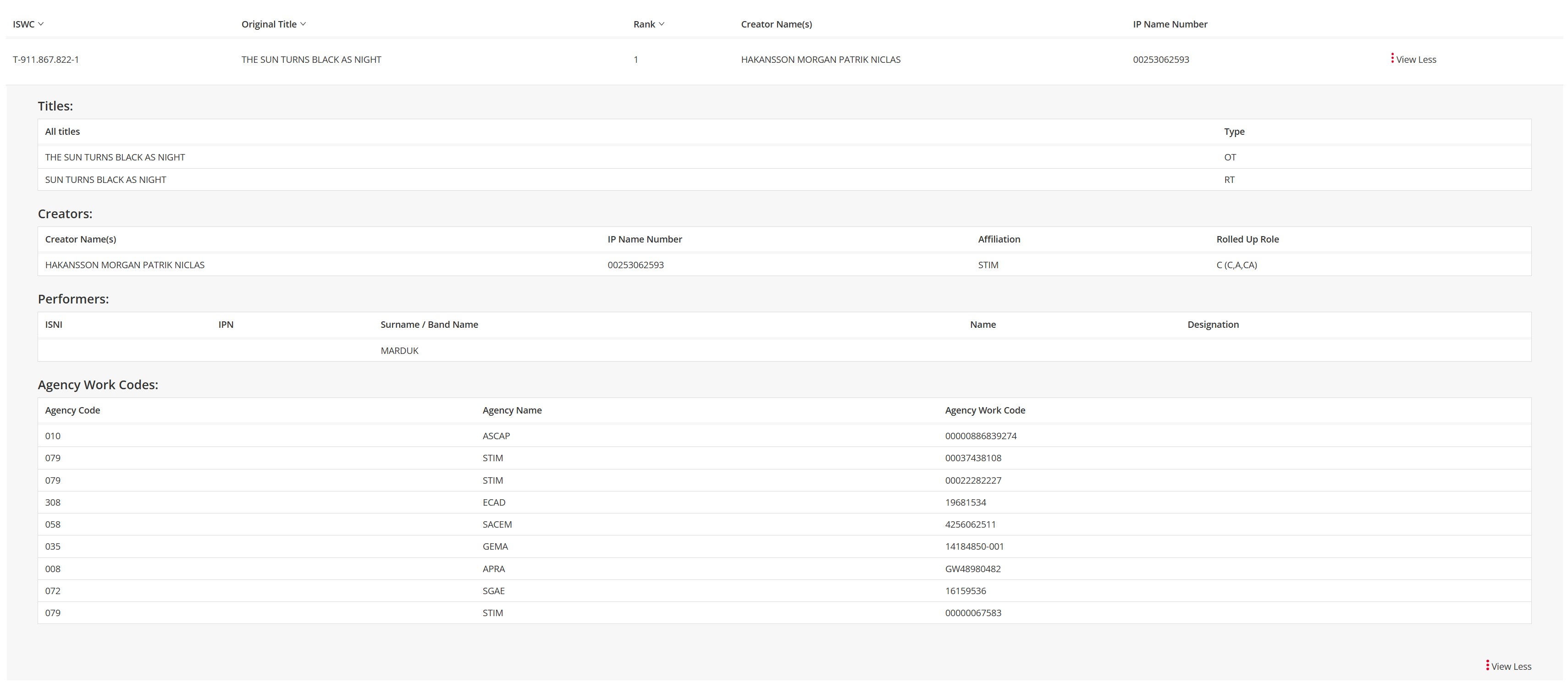 ISWCNet sounds interesting. In my linked example, if I search for the track The Sun Turns Black as Night (which is credited as just Marduk from the liner notes), I find this result: