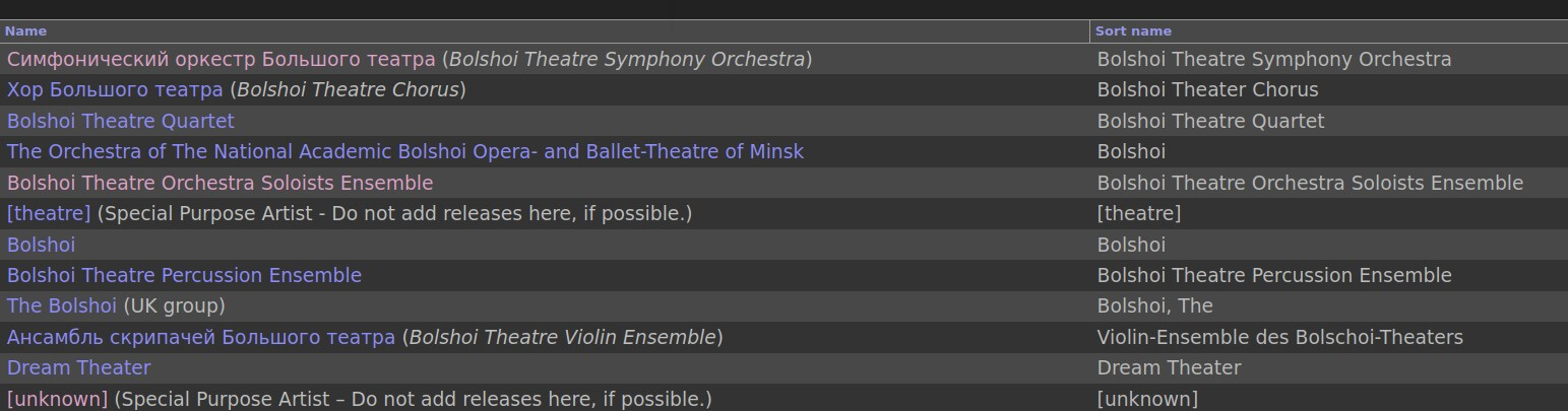 The cover lists “Bolshoy Theatre Orchestra Brass Section” as one of the artists. That specific artist title does not exist in the MB database as far as I can find (ignoring the spelling of “Bolshoy”. I’ll deal with that in the “credited as”). I did find it on Discogs, however, as a variation (their equivalent of an alias) of “Bolshoi Theatre Orchestra Soloists Ensemble,” and that group does exist in MB. Discogs apparently decided that any sub-set of the BTO would just be a variant of the Soloists Ensemble, as there are a large number of variants listed.