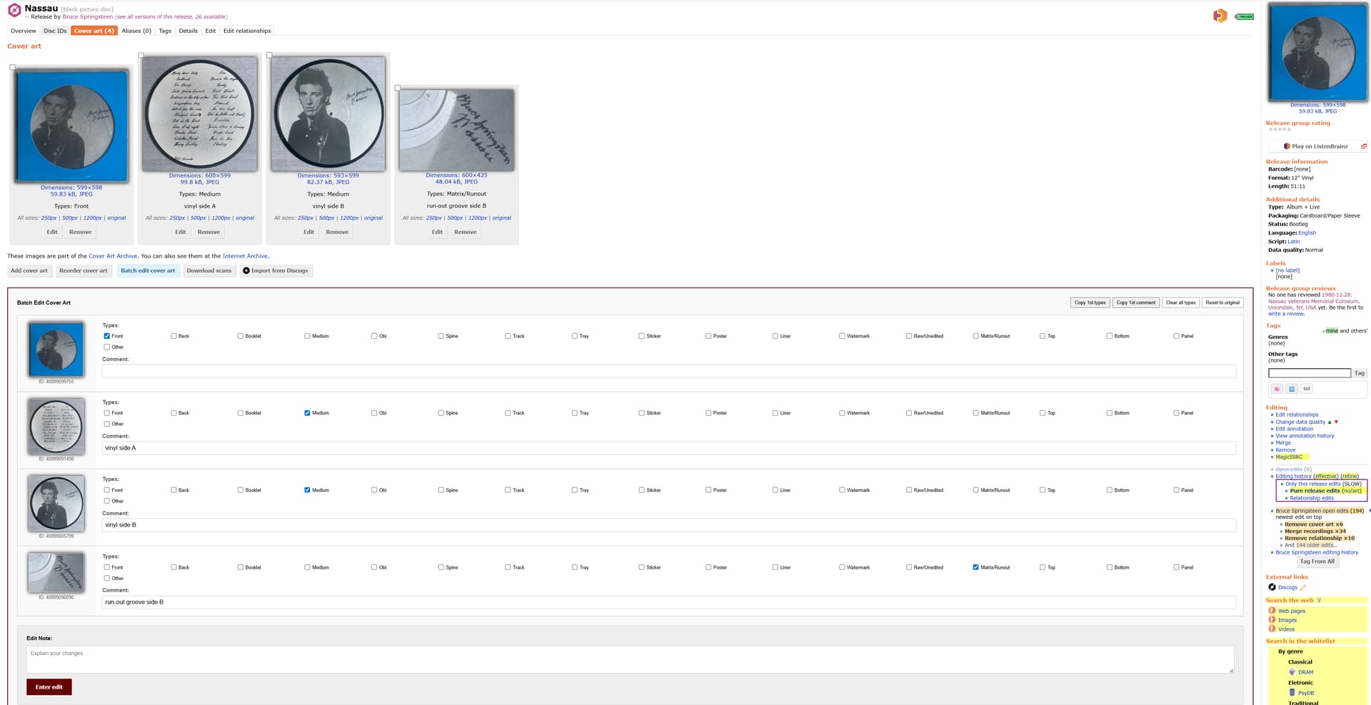 The userscript adds a “Batch edit cover art” button after the standard “Add cover art” and “Reorder cover art” buttons. It then loads the metadata off all the images in a container (it also offers a couple of convenience buttons like “Clear all types” and “Reset to original”). In that container you can change types and comments of images as usual, and submit them all at once. The script takes care to just submit data which has really changed and also warns if no change are made at all.