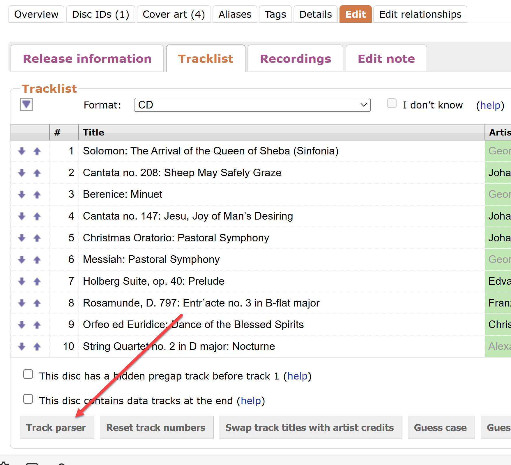 Be aware also to not use en dash ‘–’ in the parser. The character is C/SG for titles like “Adagio – Allegro – Presto”, but at the same time also a default divisor for that field, shoving the stuff to the right of it into next field; and as neither ‘Presto’ nor ‘Haydn’ would qualify as track durations, that may be how those drop out. To have the full data CSG:d, you have to manually correct or add after parsing. I usually parse with a visually different character, change it manually, then go on to save.