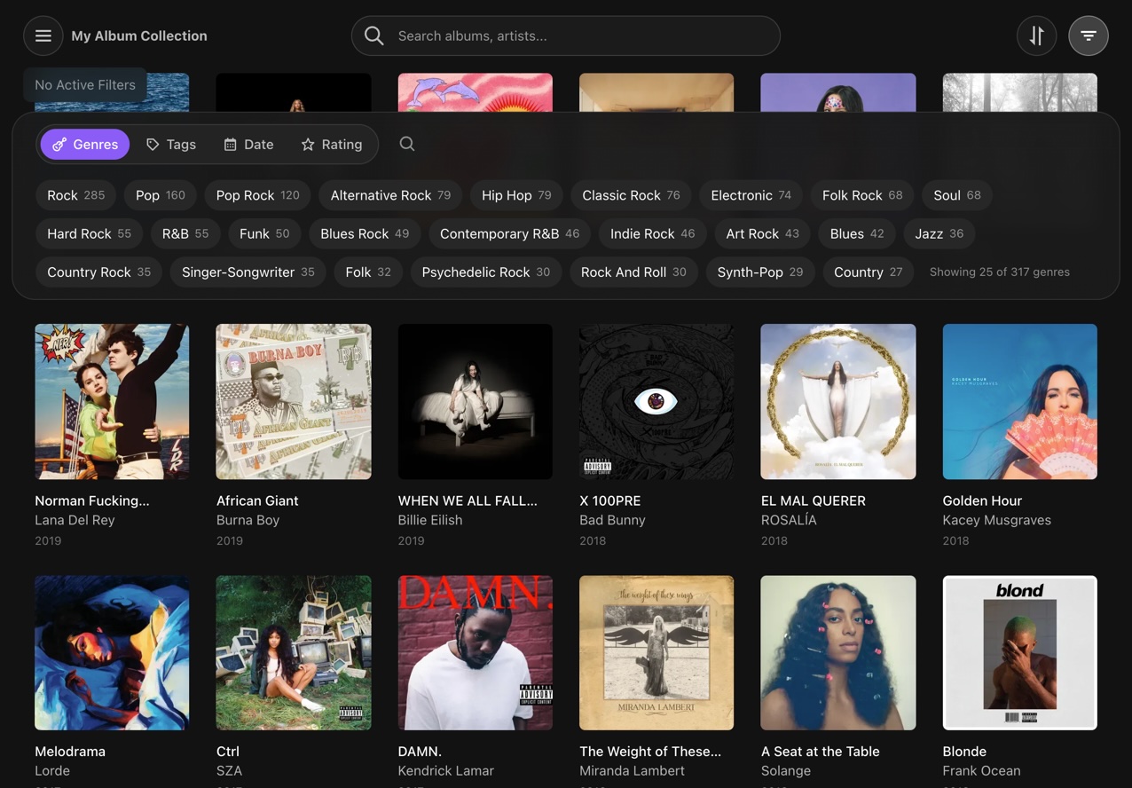 I’ve been using MusicBrainz to manage my music library independently of streaming services, and it’s been great for that. But once my collection grew to 1,000+ release-groups, I found it hard to actually browse and discover what’s in there. I wanted to do things like “show me all jazz albums from the 80s” or “filter by rating”.