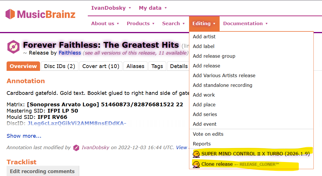 I’d like to add the CD ToCs read by Picard. I created a new release in the same release group and copied over the title and artists using the track parser. Now I can add the ToCs to those easily. The resulting entry now has all of the information I need for my purposes, but I’m missing the recordings and a load of other relations from the Digital Media release. Even the cover art is relevant.