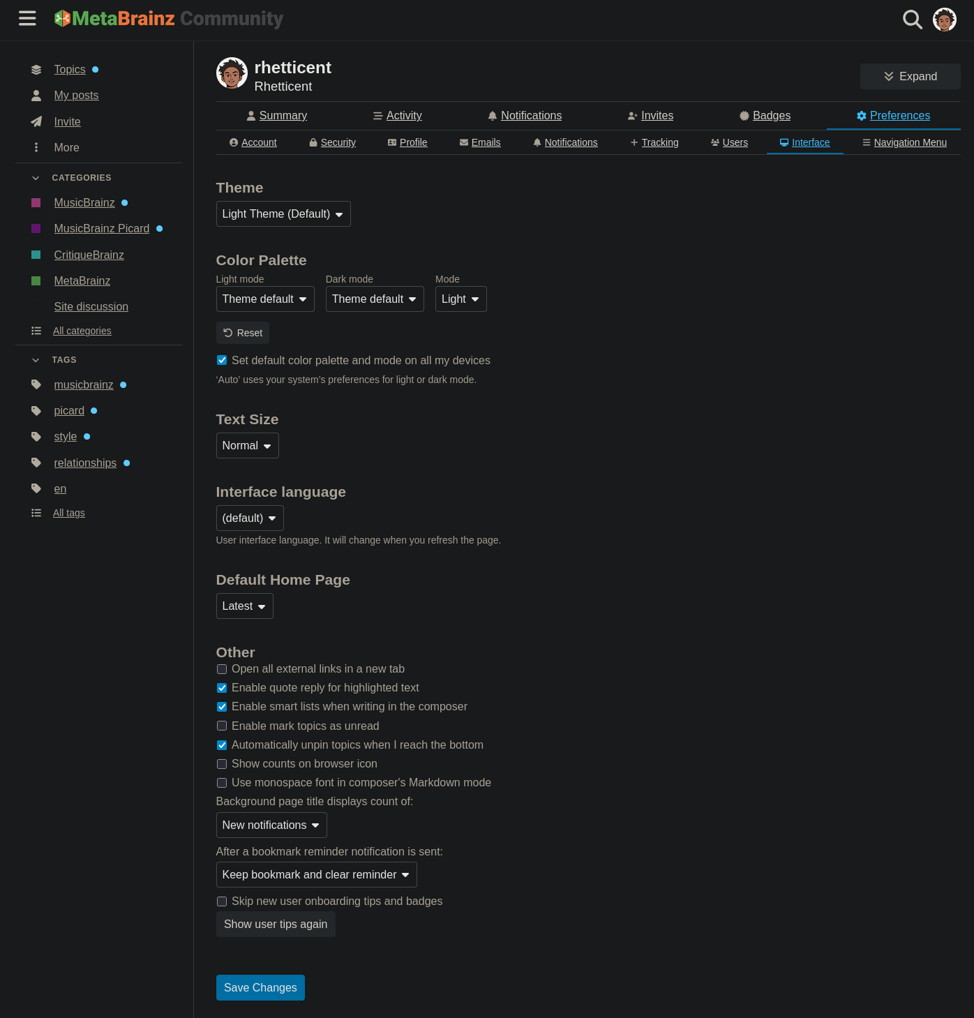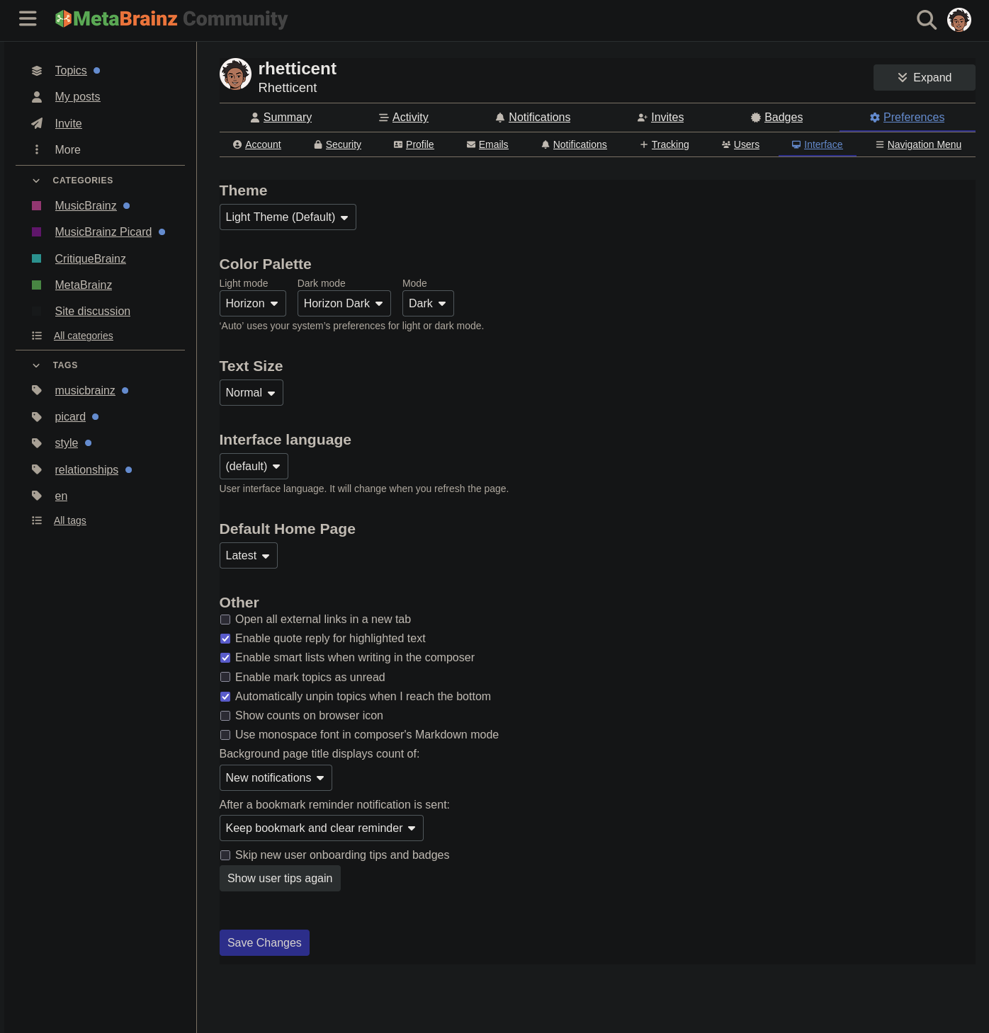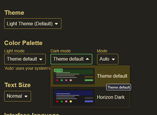 edit: I wonder if the themes might need a rework to be clearer, at least if the color palettes are a part of the themes… like a MetaBrainz theme and a Horizon theme, with light and dark mode color palettes