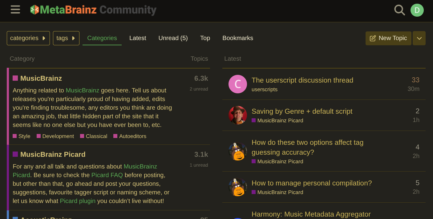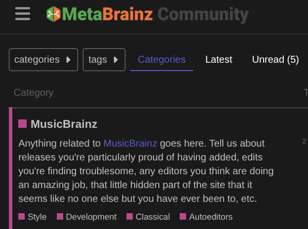 Was there a recent Discourse update that’s disagreeing with local MeB customizations? When I load community.metabrainz.org today (Chrome 138.0.7204.232 with prefers-color-scheme: dark), this is what I see: