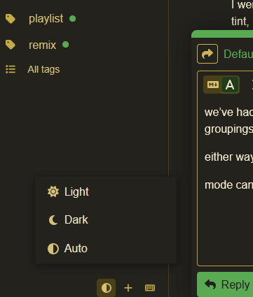mode can be changed on any page as well, I believe, with this button at the bottom of the sidebar, that way you can switch between light and dark mode manually if you’d like (I believe “Auto” is based on your device’s settings). don’t know if this is on the mobile version or not
