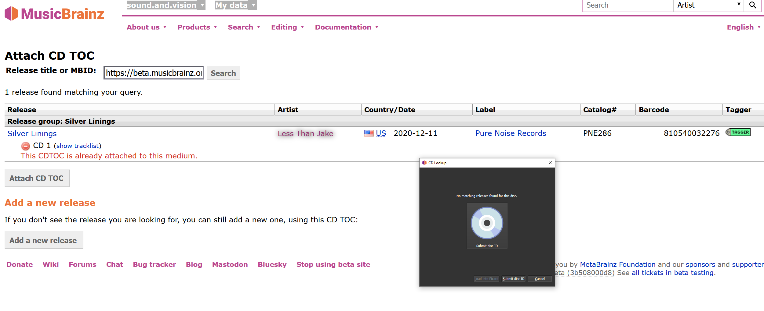 Clicking Lookup CD in Picard tells me it can’t find a match, so I go to submit, insert the release ID and it tells me it’s already linked?