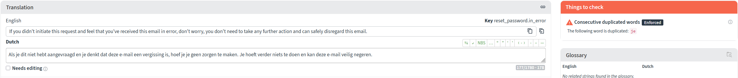 Weblate complains about a repeated word in a translation, but that repetition is totally valid. However, I can’t dismiss the error, because it is ‘enforced’: