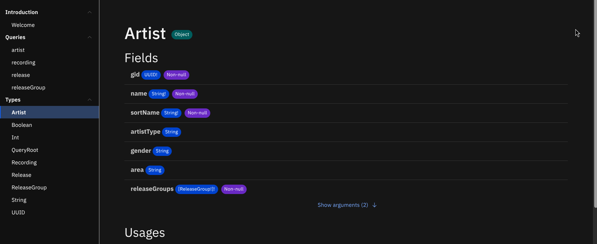 type Artist { mbid: ID! name: String! sortName: String! disambiguation: String type: String gender: String area: Area beginArea: Area endArea: Area beginDate: PartialDate endDate: PartialDate ended: Boolean! country: String ipis: [String!]! isnis: [String!]! aliases: [Alias!]! tags: [Tag!]! genres: [Genre!]! rating: Rating annotation: String releaseGroups: [ReleaseGroup!]! releases: [Release!]! } -