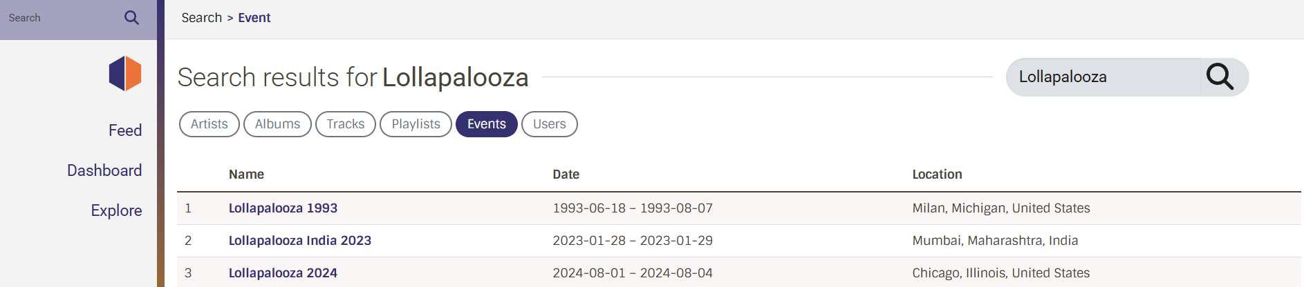 - The search would rank out by the event name first, then location/venue, then artist