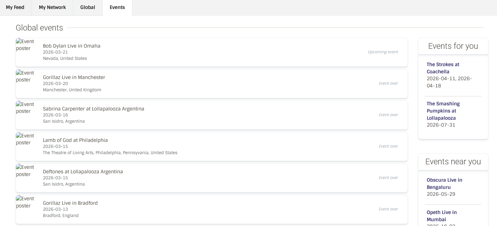- Global events page: