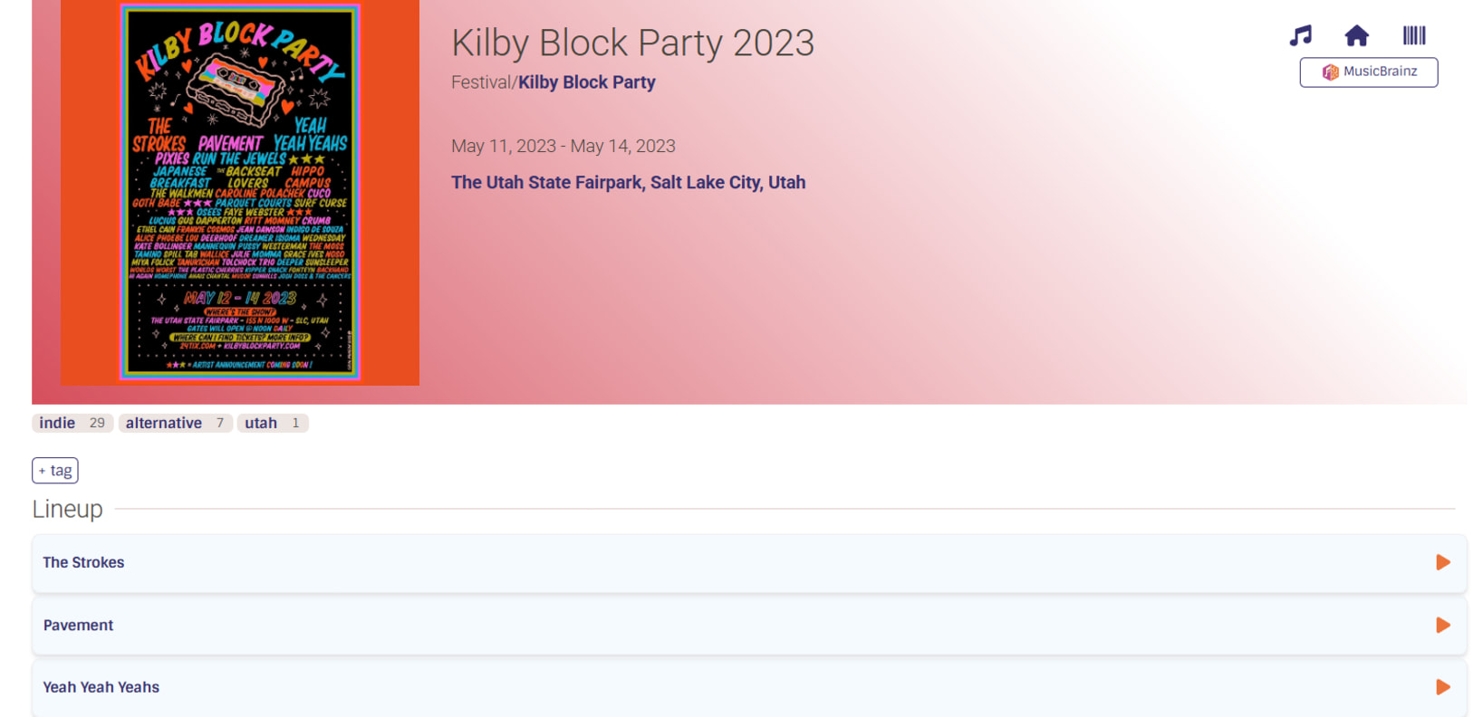 - Festival lineup with links to “{Artist} at {Festival}” for each performer