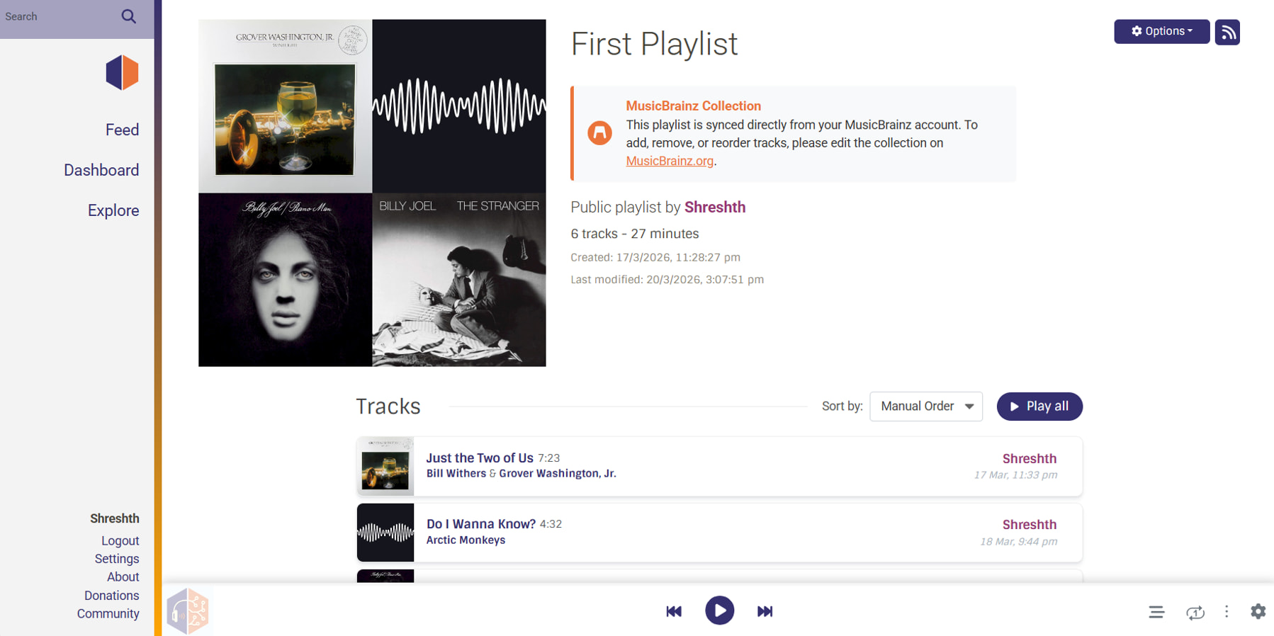 Read-Only Rendering: The collection detail page renders exactly like a standard playlist, but safely removes the drag-and-drop hooks and delete actions, reinforcing that the source of truth remains MusicBrainz.