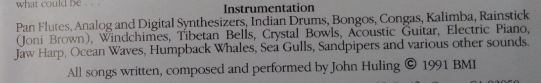 Here’s the relevant part of the booklet. Based on “all songs … performed by John Huling”, I credited him for all the instruments except rainstick. I’m not sure extending that to field recording makes sense though.