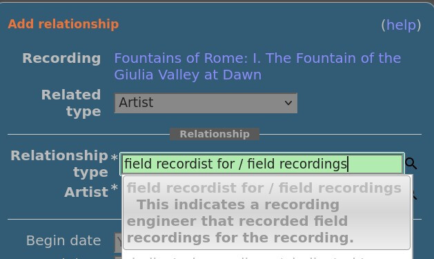 I still like the “field recording” Artist type for this, even without a field to specify the sounds recorded, but that’s just me. I suppose a “task” field could be added, like you see on Engineer artists, but I don’t know that it’s necessary. After all, it says “…and various other sounds.”