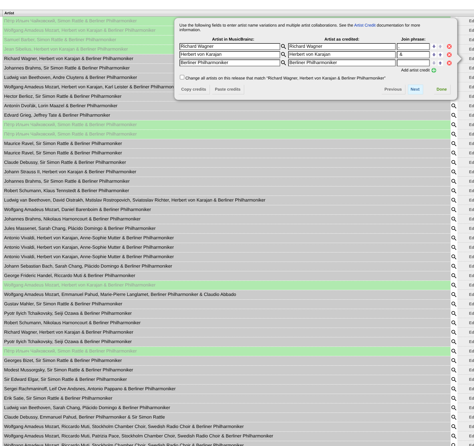 Even if you (mistakenly) insist that for data quality purposes users capturing releases should do the assignment because this will somehow magically give rise to better data, why does the option that reads “Change all artists on this release that match “Richard Wagner, Herbert von Karajan & Berliner Philharmoniker”“ not then at the very least find all instances of the individual names and assign them across all tracks rather than only those that happen to have “Change all artists on this release that match “Richard Wagner, Herbert von Karajan & Berliner Philharmoniker”“ in that sequence in the track listing.