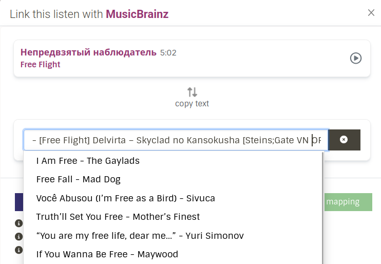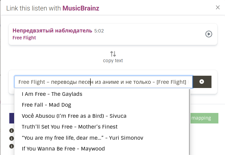 In its description and video itself a Russian name for this release was specified: “Непредвзятый наблюдатель”. Because it is the Russian cover, I used the Russian name as its main name for storing. So in MB it is stored as “Free Flight - Непредвзятый наблюдатель” and all other options are stored as aliases. And of course, every scrobbler only used original YT credits, so there wasn’t any chance, that LB will suggest the recording that I need.