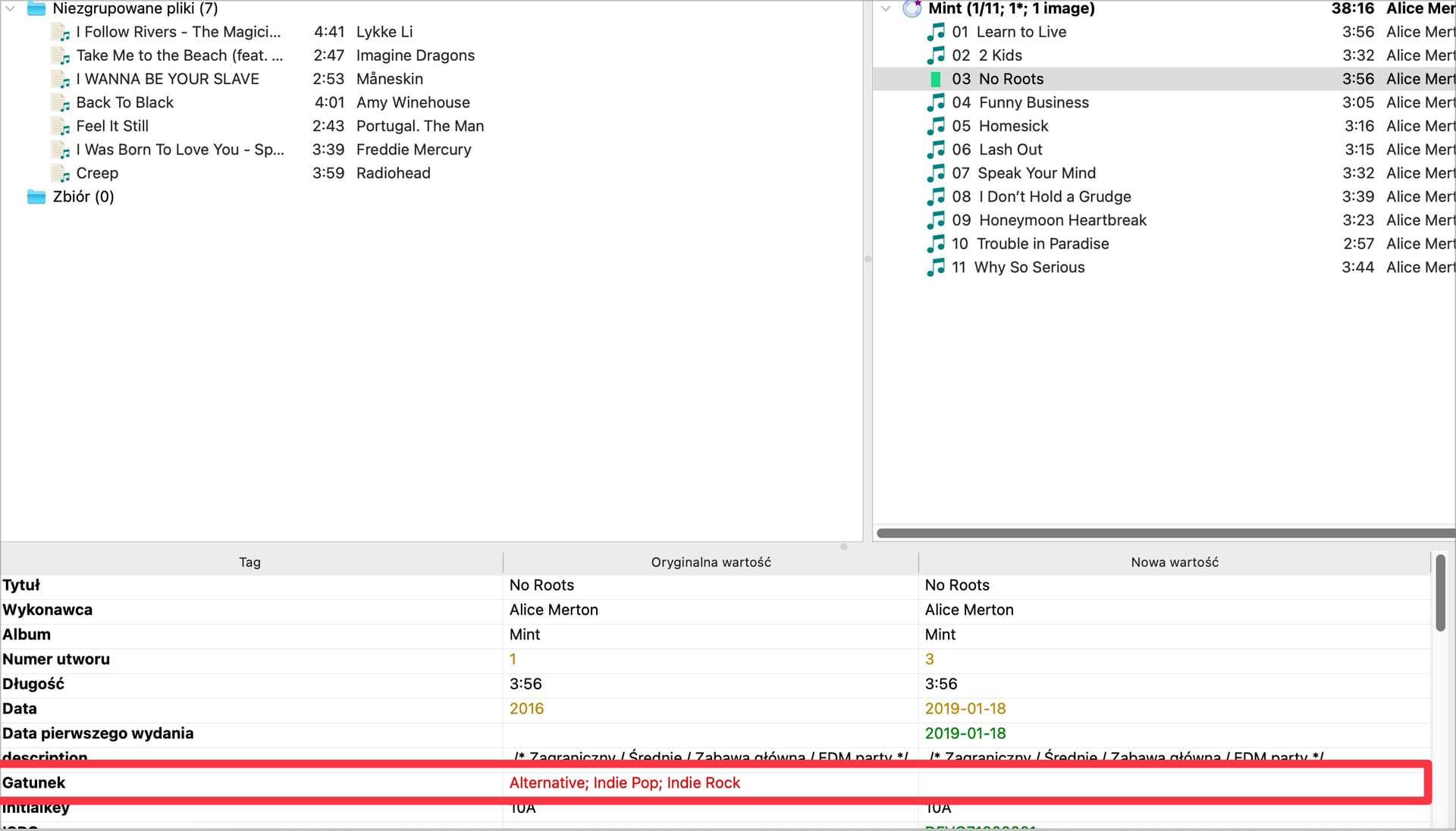 Because of clear existing tags the genre in the file would be removed (original value shown in red, no new value).