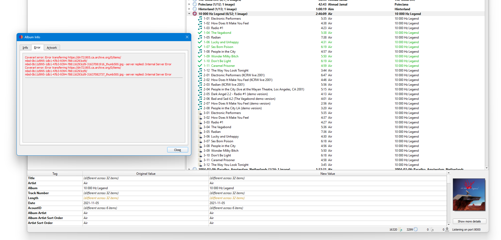 E: 09:48:16,193 ui/item.error_append:108: <Album d7a383ad-1853-4356-b1f2-98cf165d166b ''>: Coverart error: Error transferring https://dn721807.ca.archive.org/0/items/mbid-d7a383ad-1853-4356-b1f2-98cf165d166b/mbid-d7a383ad-1853-4356-b1f2-98cf165d166b-5303198392_thumb500.jpg - server replied: Internal Server Error