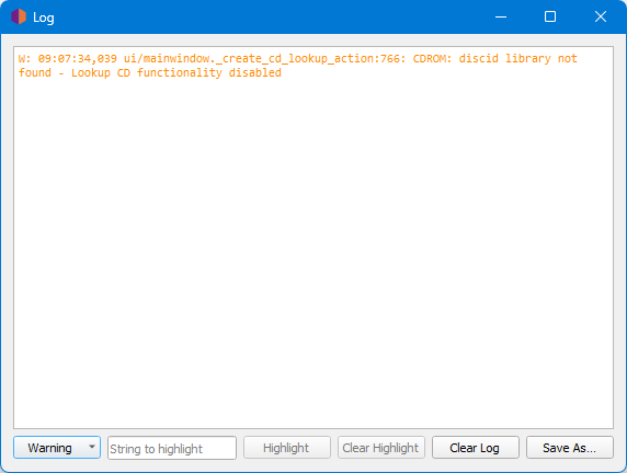 W: 09:07:34,039 ui/mainwindow._create_cd_lookup_action:766: CDROM: discid library not found - Lookup CD functionality disabled