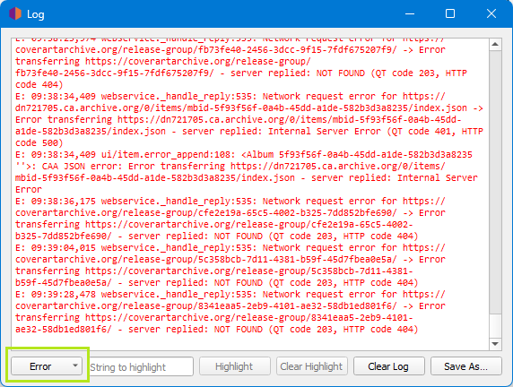 E: 09:40:52,621 webservice._handle_reply:535: Network request error for https://coverartarchive.org/release-group/579ef0de-ba75-44cc-b4ac-8e787c71634c/ -> Error transferring https://coverartarchive.org/release-group/579ef0de-ba75-44cc-b4ac-8e787c71634c/ - server replied: NOT FOUND (QT code 203, HTTP code 404)