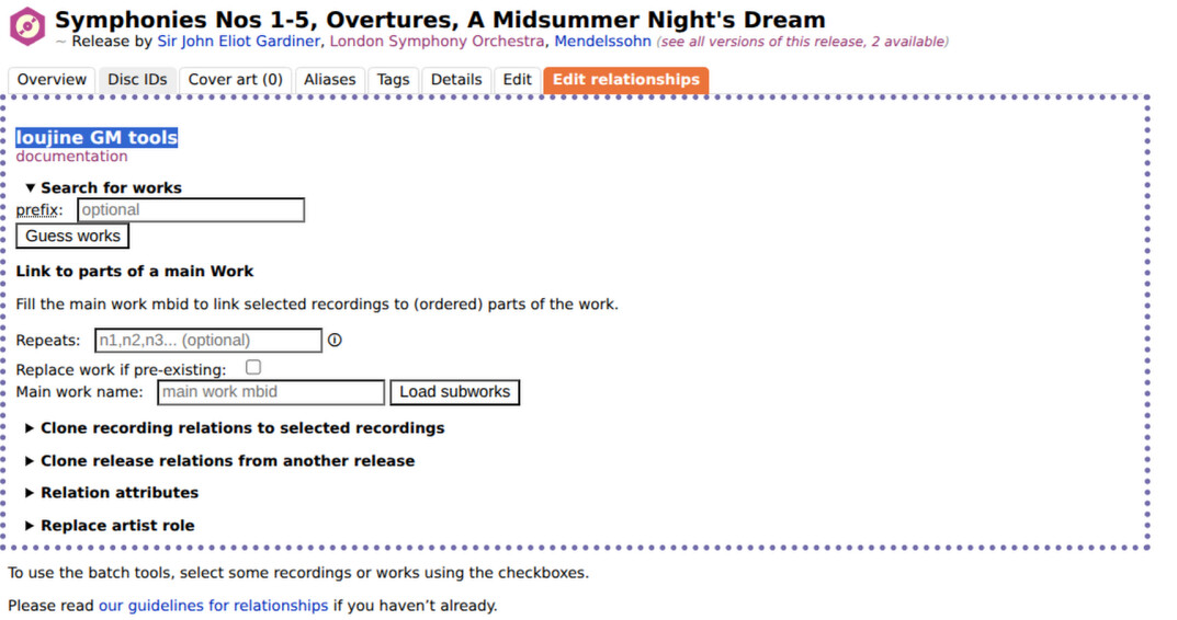 3. However no matter what recordings are selected, the “apply” button is inert. For example, attempting to use “Clone recording relations”, I paste the source MBID into the box and select those I want to clone to. But clicking “apply” has no effect at all.