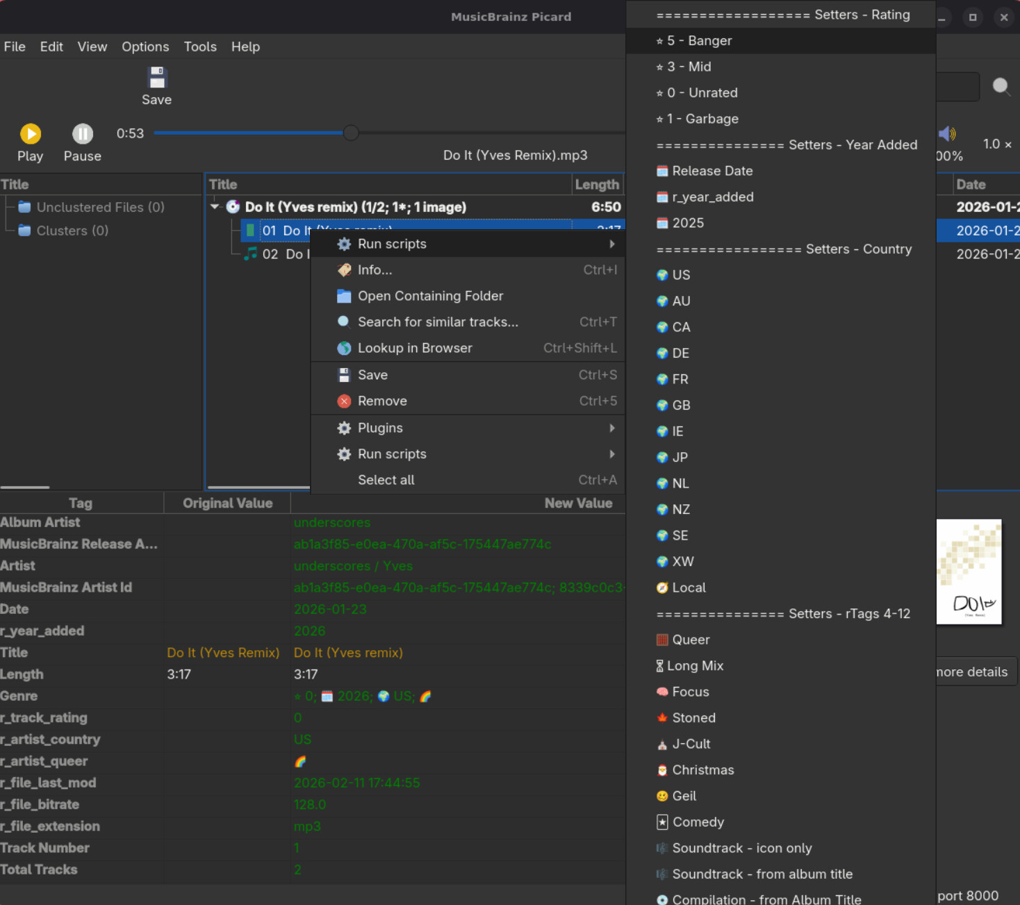 Regarding importing ratings into MusicBrainz: this is another area I’ve paused pursuing myself as it personally feels a little clunky, doesn’t quite work how I expect it to, and means relying on another party to store this data. However, there may be others that have better ideas on how this can be accomplished.