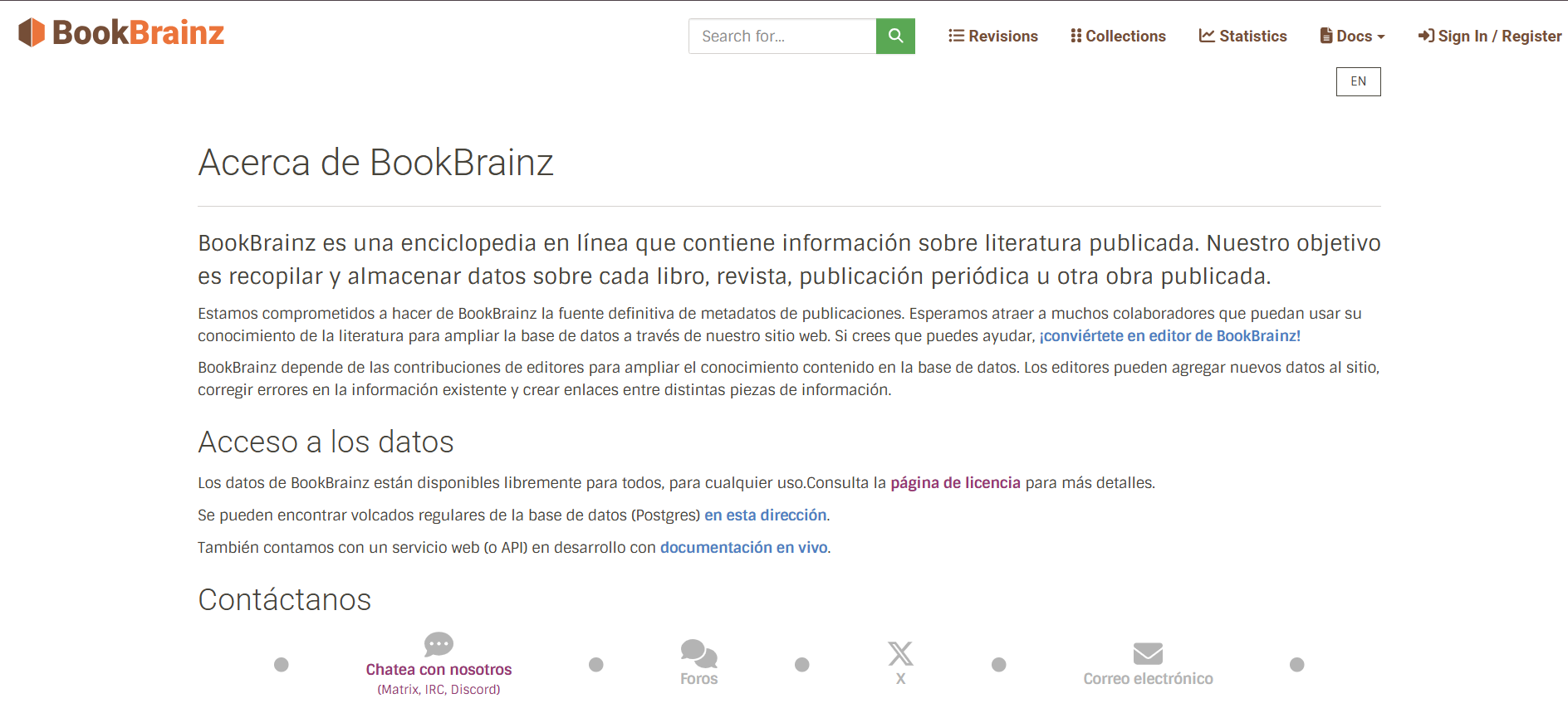 "contributors": "BookBrainz depende de las contribuciones de editores para ampliar el conocimiento contenido en la base de datos. Los editores pueden agregar nuevos datos al sitio, corregir errores en la información existente y crear enlaces entre distintas piezas de información.",