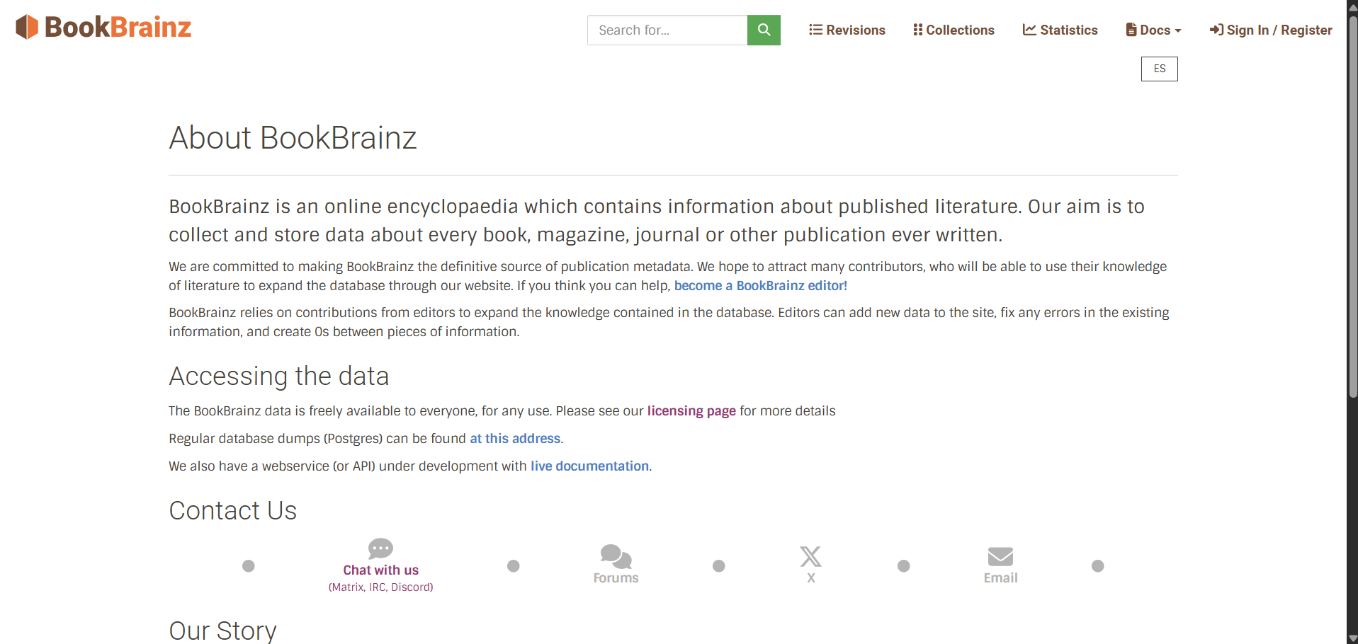 "intro": "BookBrainz is an online encyclopaedia which contains information about published literature. Our aim is to collect and store data about every book, magazine, journal or other publication ever written.",