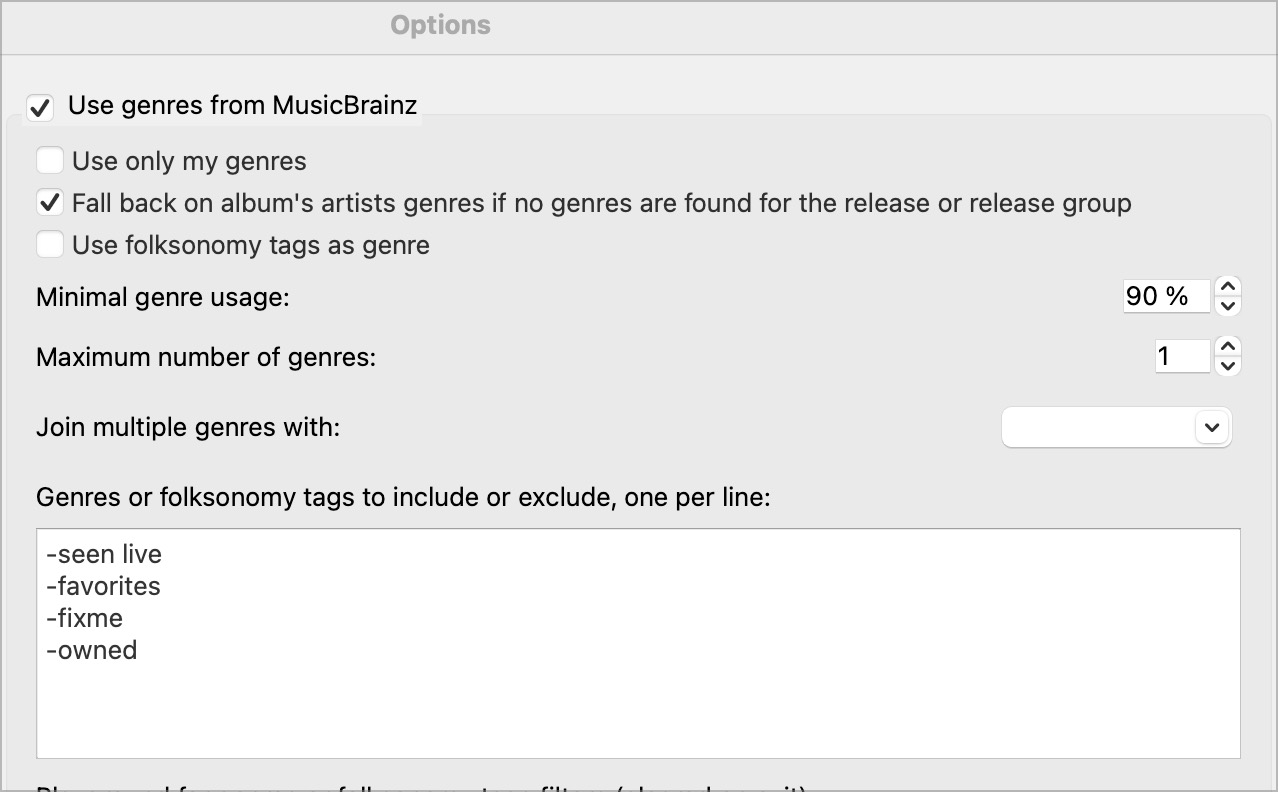 Do you use any genre plugins? The settings above are for the built-in functionality of fetching genres from MusicBrainz.