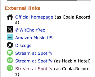 Obviously some of these clearly do not correspond to every single various artists release ever (official homepage Coala Records, @WitChoirRec, Stream as Hazbin Hotel, Stream as Coala.Records), so I wondered if they should/could be deleted? (I don’t get the edit button for this artist so cannot do it myself)