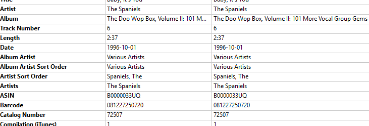Tagging this way makes sure the 4CD compilation appears as a single album in your collection. With each track having the correct credit for playback. If you changed “Various Artist” to the “The Spaniels” then Plex would give you 100 different albums with one track each.
