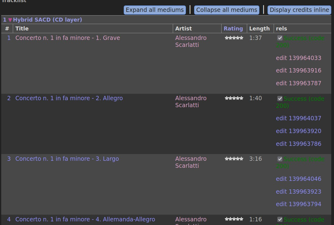I’ve begun making use of Loujine’s “Replace recording artists from a Release page” GM script in the past few days. Today I came across a release that is a Hybrid SACD with three layers. I selected all recordings on all three layers, and ran the script. It processed through all 105 tracks (35 per layer), but it listed the edits it created under the first layer only, like this:
