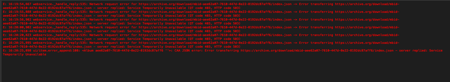E: 16:23:42,517 ui/item.error_append:108: <Album aee62a07-7610-447d-8e22-8192dc87aff6 ‘’>: CAA JSON error: Error transferring https://archive.org/download/mbid-aee62a07-7610-447d-8e22-8192dc87aff6/index.json - server replied: Service Temporarily Unavailable
