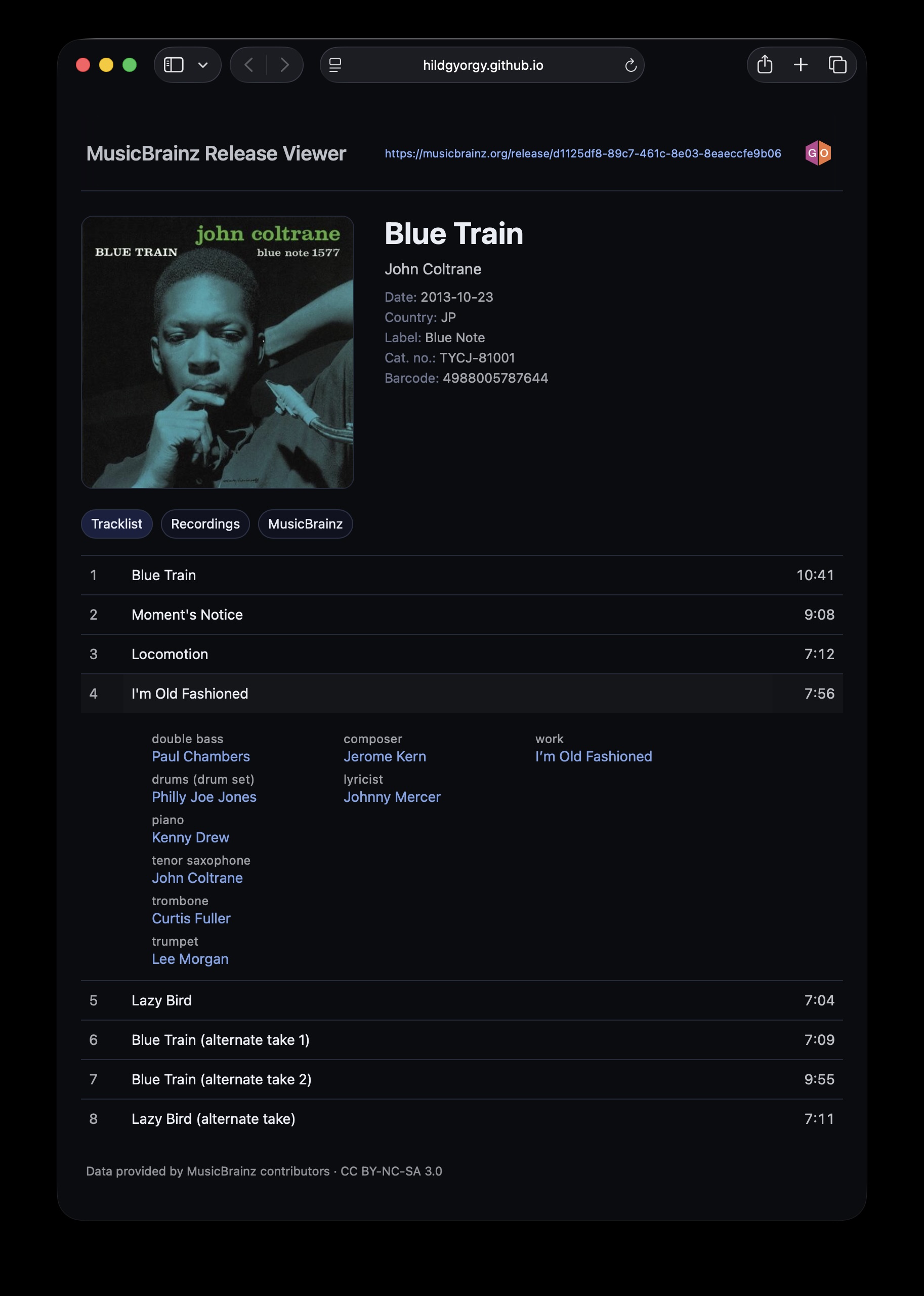 It’s a read-only web viewer that tries to present a release in a slightly different way, mainly for personal exploration and learning purposes. Nothing is written back to MusicBrainz, and it’s definitely not meant as a replacement for the website.