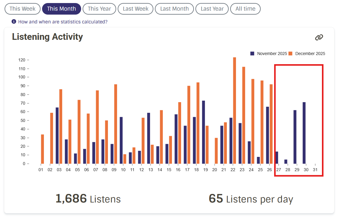 With the end of the year in sight, just wondering if there’s something broken with the stats generation? Mine haven’t been updated since Saturday, and weekly jams haven’t been refreshed either.