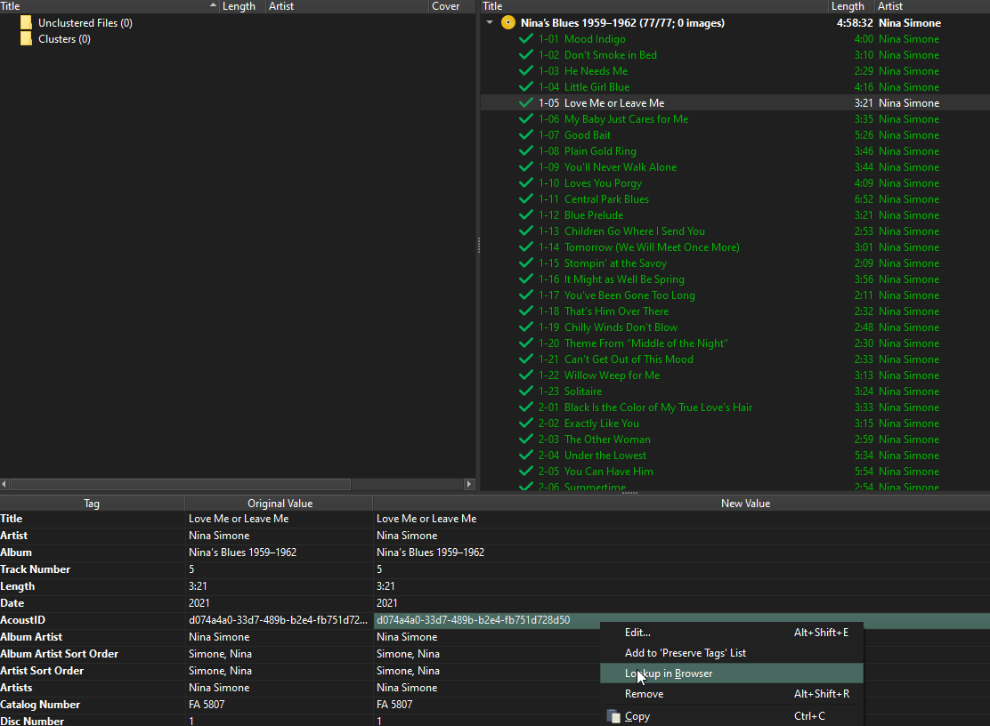 D: 12:54:48,806 acoustid._on_recording_resolve_finish:159: AcoustID: Lookup successful for 'D:\d-m\rrippinn\simone, nina - nina's blues 1959-1962.flacf\1.05 - Love Me or Leave Me.wav' (recordings: 1)