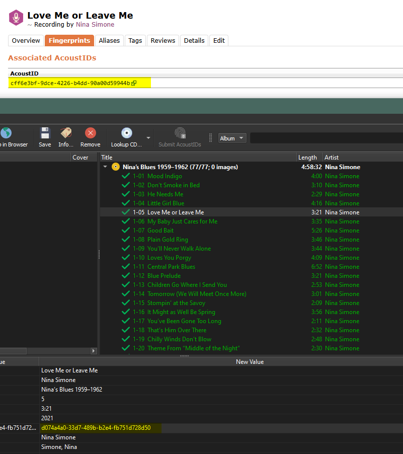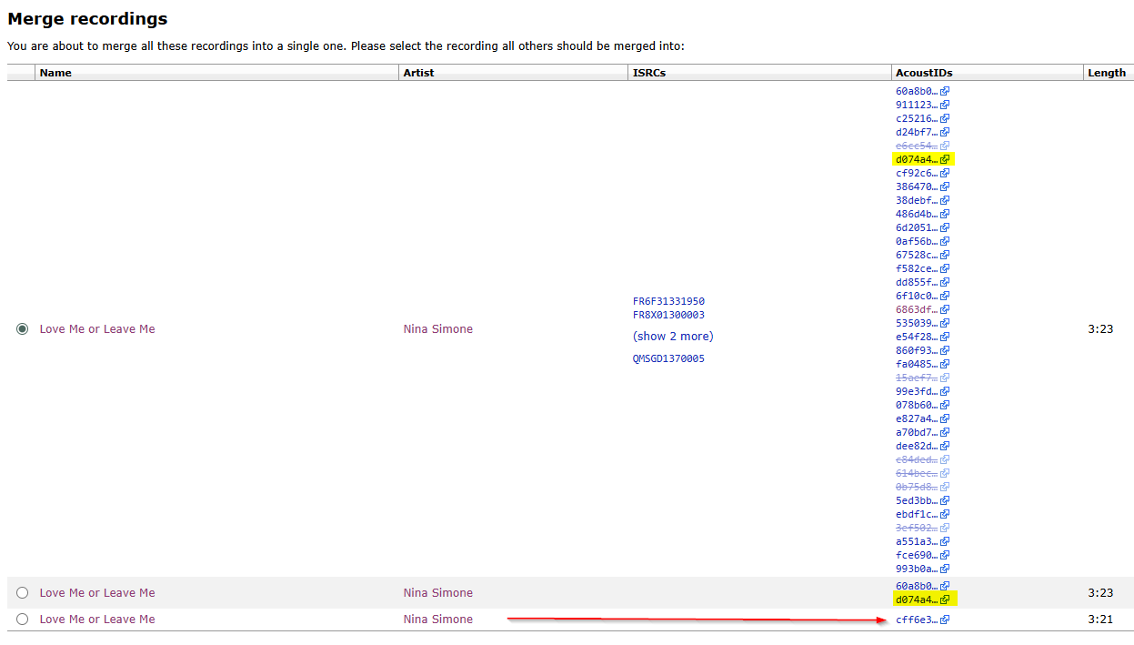 Thanks, very clear and super-interesting! Especially as I’ve scanned tens (or hundreds?) of thousands of tracks and have never seen this before. I suppose a recording that has seen many many releases, as is the case with Nina Simone in Europe (OT but rights ownership must have dropped), is more likely to have more nuance in the IDs associated with it as any two may be mastered differently? Anyway the picard response makes sense now, though has no UI feedback for such a rare case. (Makes people like you have to respond to forum posts like this